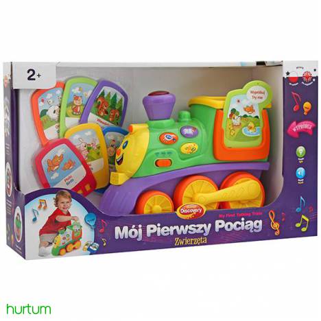 DUMEL DISCOVERY DD42317 Mój pierwszy pociąg Zwierzęta przydatna jest podczas nauki języka angielskiego. Posiada 6 dwustronnych kart z wizerunkiem 12 zwierząt. Gdy dziecko naciśnie przycisk ze znakiem zapytania, usłyszy polecenie aby znalazło kartę z konkretnym zwierzątkiem oraz umieściło ją w miejscu na kartę. Zabawka wydaje realistyczne dźwięki jak lokomotywa.