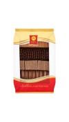 Wafle z kremem orzechowym w polewie czekoladowej mlecznej.