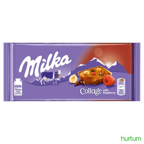 Wyrób cukierniczy z kremem kakaowym (50%), czekoladą mleczną z mleka alpejskiego (40%), kawałkami czekolady (5,5%), karmelizowanymi kawałkami orzechów laskowych (2%) i suszonymi malinami (1%).