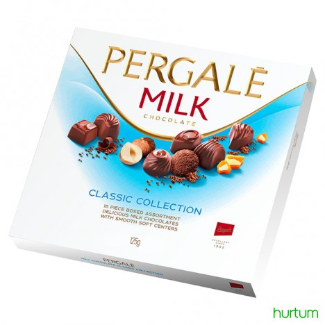 Zestaw pralin z czekoladą mleczną. Praliny z nadzieniem o smaku czekoladowym 11%, nadzienie czekoladowe 11%, nadzienie truflowe 9%, nadzienie z orzechów laskowych 9%.