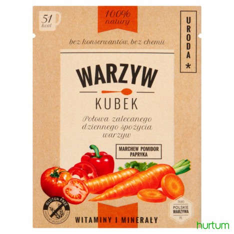 Kubek warzyw URODA to kompozycja czerwonych warzyw, która pomoże zadbać o Twój wygląd zewnętrzny i pomoże w zahamowaniu przedwczesnych efektów starzenia się skóry. Skład kubka URODA to: marchew, pomidor, papryka, kolendra.
