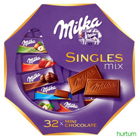 Mieszanka czekoladek mlecznych z mleka alpejskiego, czekoladek mlecznych z mleka alpejskiego z nadzieniem kakaowym, czekoladek mlecznych z mleka alpejskiego z nadzieniem o smaku truskawkowo-jogurtowym, czekoladek mlecznych z mleka alpejskiego z siekanymi orzechami laskowymi.