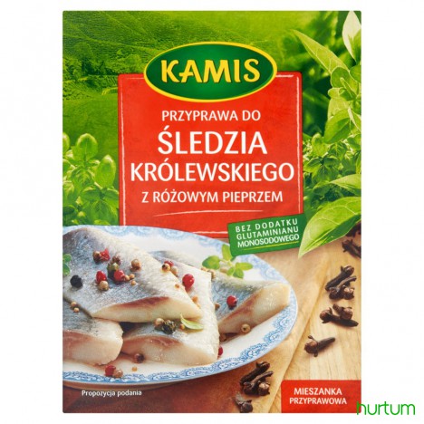 Składniki (dla 6 osób): 6 filetów śledziowych, 1 średnia cebula, 1,5 szklanki wody, 0,5 szklanki octu 10%, 1 opakowanie Przyprawy do śledzia królewskiego z różowym pieprzem Kamis.