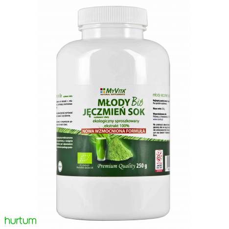 Jęczmień jest rośliną znaną i uprawianą od bardzo dawna. Stanowił podstawę wyżywienia pierwszych cywilizacji z Egipcjanami na czele. Dzisiaj jest produktem niezwykle popularnym i cenionym ze względu na swoje właściwości i bogactwo składników odżywczych. Produkt ma nową, znacznie udoskonaloną formułę, w której zwiększono stopień skoncentrowania ekstraktu z trawy jęczmiennej i aktualnie wynosi 50:1. Ekstrakt z jęczmienia powstaje przez wyciskanie z młodych pędów soku, następnie suszy się go w niskiej temperaturze pod odpowiednim podwyższonym ciśnieniem. Pozwala to na zmniejszenie straty składników odżywczych i zachowanie witamin i minerałów (w stosunku do produktów z sproszkowanej trawy jęczmiennej). Produkt jest w 100% naturalny i nie dodaje się do niego żadnych wypełniaczy i konserwantów. Sproszkowany sok z młodego jęczmienia posiada certyfikat ekologiczny PL-EKO-07, co potwierdza jego wysoką jakość i gwarantuje, że na żadnym etapie wytwarzania nie zostały użyte chemiczne środki ochrony roślin oraz nawozy sztuczne. Uprawy ekologiczne są ściśle kontrolowane przez uprawione do tego celu organy i jednostki certyfikujące. Sproszkowany sok z młodego jęczmienia to prawdziwe bogactwo witamin i minerałów o wysokiej wchłanialności. Zawiera między innymi magnez, krzem, mangan, chrom, bor, potas, wapń, srebro, żelazo, fosfor, cynk i miedź oraz witaminy C, E, K, witaminy z grupy B, cholinę, kwas pantotenowy. Charakteryzuje się również wysoką zawartością beta-karotenu. Najważniejszym składnikiem zawartym w młodym jęczmieniu jest chlorofil. Wykazuje wiele cennych właściwości wspomagających działanie organizmu. oraz zapewnia uczucie sytości. Naturalnie oczyszcza z metali ciężkich i zbędnych produktów przemiany materii. Składniki: 100% sproszkowany sok (ekstrakt) z młodego jęczmienia (Hordeum L.) pochodzący z kontrolowanych upraw ekologicznych. Sposób użycia: 1 g proszku (płaska łyżeczka) wymieszać z chłodną wodą lub sokiem. Stosować 2 razy dziennie. Przechowywanie: Przechowywać w temperaturze pokojowej, w sposób niedostępny dla małych dzieci.