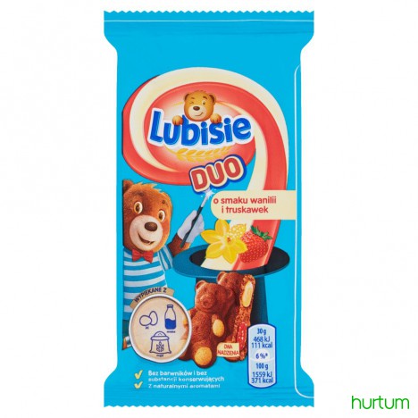 Ciastko biszkoptowe z nadzieniem (15%) z truskawkami (2,6%) i nadzieniem o smaku waniliowym (15%).