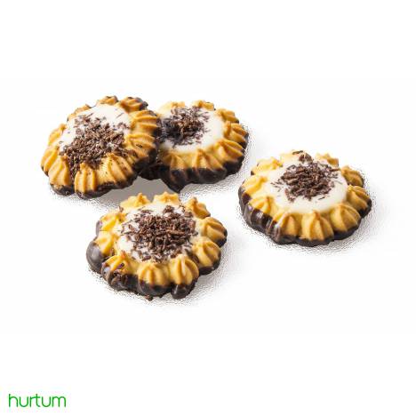 Kruche ciasteczko podlane czekoladą z nadzieniem śmietankowym, posypane płatkami czekolady.