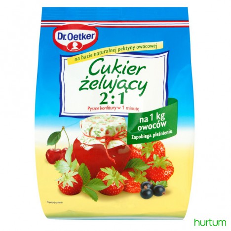 Domowe przetwory z Cukrem żelującym są jeszcze prostsze. Nie trzeba niczego odmierzać! Do świeżych, umytych owoców wsyp Cukier żelujący, zagotuj i gotowe! Dżemy i konfitury z produktami Dr. Oetkera nie pleśnieją, nie rozwarstwiają się i mają wspaniałą, dżemową konsystencję. Jeżeli preferujesz słodsze dżemy, polecamy Cukier żelujący 2:1, a jeśli wolisz przetwory niskosłodzone - Cukier żelujący 3:1.