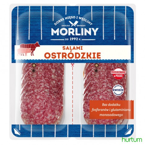 Kiełbasa wieprzowo-wołowa drobno rozdrobniona wędzona parzona suszona.