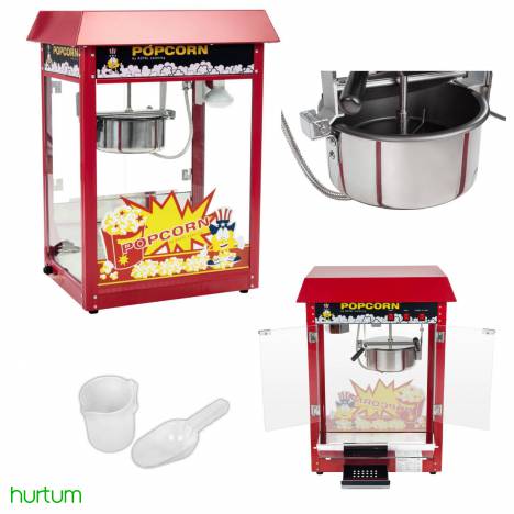 Profesjonalna, bardzo wydajna maszyna do produkcji popcornu ze szklaną szafką chroniącą przed czynnikami zewnętrznymi. W dolnej części maszyny zamontowano praktyczną szufladkę do której wpadają nieprzerobione ziarenka kukurydzy.