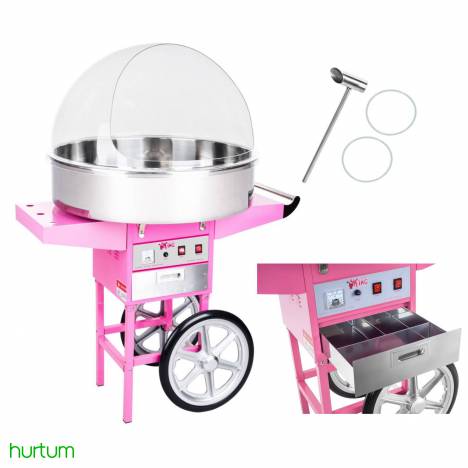 Profesjonalna maszyna do produkcji waty cukrowej zamontowana na jezdnym wózku. W dolnej części maszyny zamontowano praktyczną szufladkę na akcesoria i pieniądze.