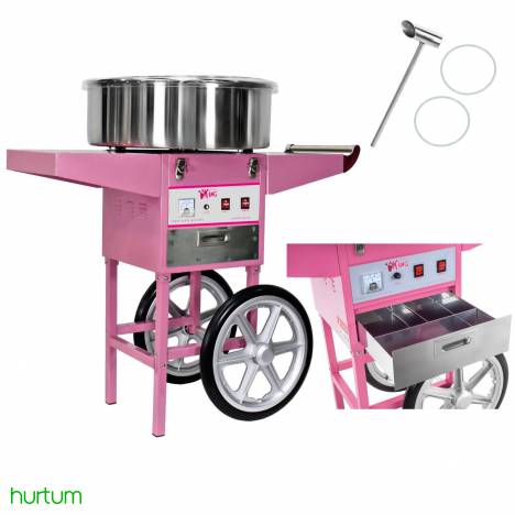 Profesjonalna maszyna do produkcji waty cukrowej zamontowana na jezdnym. W dolnej części maszyny zamontowano praktyczną szufladkę na akcesoria i pieniądze.