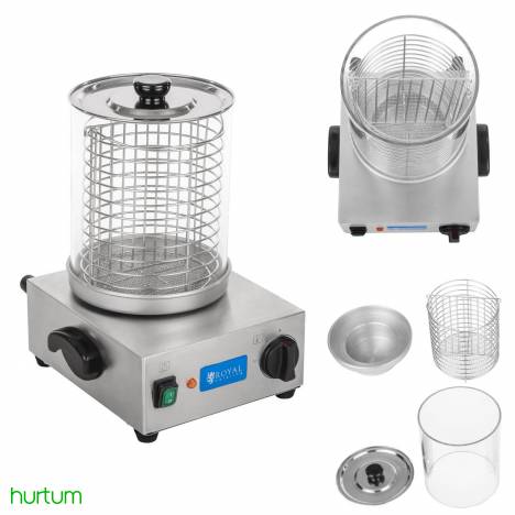Podgrzewacz do parówek HOT DOG z okrągłym, szklanym cylindrem, który można zdemontować i umyć w zmywarce. Praktyczne i sprawdzone urządzenie, które efektownie prezentuje podgrzewane kiełbaski.