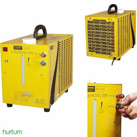 Spawanie prądem powyżej 150 A, zwłaszcza w dłuższych cyklach pracy, wymaga odpowiedniego chłodzenia uchwytu. Wiele spawarek, mimo iż wyposażone są w odpowiednie przyłącze, nie ma w zestawie odpowiedniej chłodnicy, przez co użytkownik nie może wykorzystać całego potencjału urządzenia. Chłodnica wodna niemieckiej marki Stamos Selection nie tylko pozwala osiągnąć pełną wydajność spawarki, ale także przedłuża jej żywotność. Sprawny obieg wody i skuteczne odprowadzanie ciepła z uchwytu zostało osiągnięte poprzez wykorzystanie w urządzeniu wydajnej pompy, wentylatora, miedzianej wężownicy i aluminiowego radiatora.