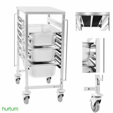 Wózek transportowy RCTW 6 GN1/1 marki Royal Catering pozwala na jednoczesne przewożenie do 6 pojemników lub tac gastronomicznych. Profesjonalny wózek cateringowy zrobiony został z wysokiej jakości stali szlachetnej, jest odporny na korozję, a także uszkodzenia mechaniczne.