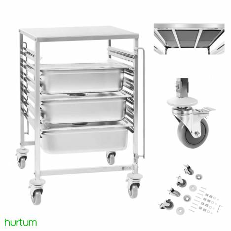 Wózek gastronomiczny charakteryzuje się łatwym czyszczeniem (otwarta konstrukcja) oraz bezpieczną eksploatacją (pionowa blokada w przedniej i tylnej części). Górny blat został umieszczony na wysokości 95 cm, od spodu wyposażony jest w listwę wzmacniającą, a także matę wygłuszającą. Blat może służyć jako półka lub powierzchnia robocza. Dodatkowo, został wyposażony w gumowe koła, które obracają się o 360.