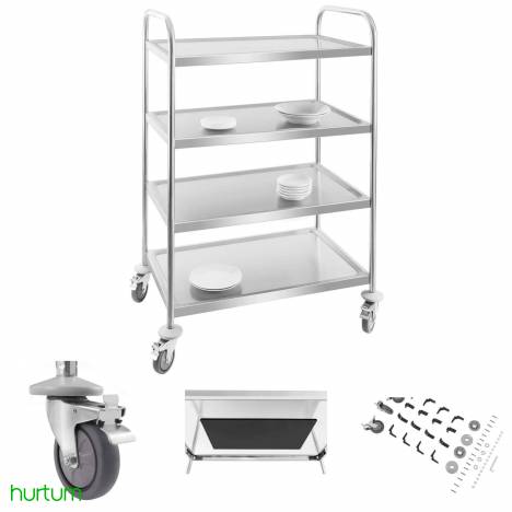 Sprzęt posiada cztery półki z rantami o wysokości 30 mm. Każda z półek posiada udźwig do 50 kg i jest wyposażona od spodu w matę wygłuszającą. Wózek kelnerski RCSW 4 ma cztery gumowe kółka, każde o średnicy 100 mm, obracają się one o 360 i posiadają własny hamulec i odbojnik.