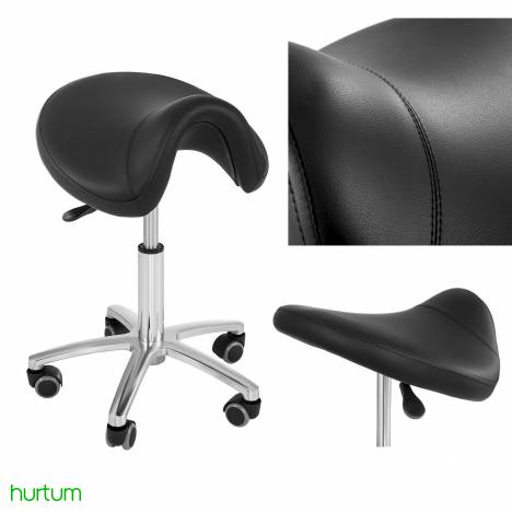 Krzesło siodłowe Sorano SH-61 do użytku w salonie kosmetycznym, fryzjerskim lub SPA. Dzięki ergonomicznej budowie model Sorano SH-61 pozwala zachować osobie siedzącej pozycję, która nie powoduje napięcia barków, odciąża stawy, kręgosłup oraz usprawnia krążenie krwi w kończynach dolnych. Krzesło się obraca; brak oparcia i kompaktowy rozmiar zapewniają dogodny dostęp do obsługiwanego klienta. Mobilność zwiększają kółka z tworzywa sztucznego, idealnie dostosowane do twardej powierzchni. Taboret kosmetyczny jest solidny i ma atrakcyjny wygląd. Wykonany został ze stali chromowanej i wysokiej jakości ekoskóry.