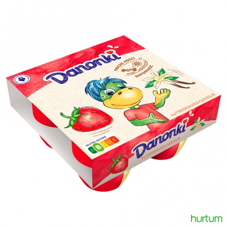 W jednym wielopaku Danonków znajdziesz serki w dwóch smakach - waniliowym i truskawkowym. A w większym kubeczku zmieści się więcej pyszności! Danonki zawierają wapń i witaminę D - zgrany duet dla mocnych kości, ponieważ są składnikami odżywczymi, potrzebnymi do prawidłowego wzrostu i rozwoju kości u dzieci. Każdy kubeczek Danonków powstał z dwóch kubeczków mleka. Ciesz się ich smakiem do woli - nie zawierają sztucznych aromatów, barwników* ani konserwantów.