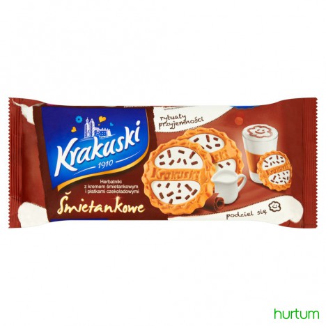 Herbatniki z kremem śmietankowym (22%) i płatkami czekoladowymi (2,4%)
