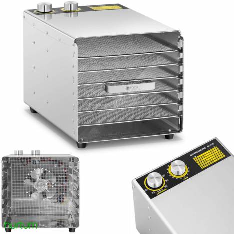 Cechy produktu: - Wydajność - grzałka 500 W szybko wytwarza temperaturę optymalną do suszenia. - Pojemność - 6 wyjmowanych tac zmieści wiele produktów. - Wygoda - automatyczny timer w zakresie 0-30 h. - Wytrzymałość - atrakcyjna i solidna konstrukcja ze stali nierdzewnej. - Regulacja - możliwość ustawienia temperatury w zakresie od 33 do 80C.