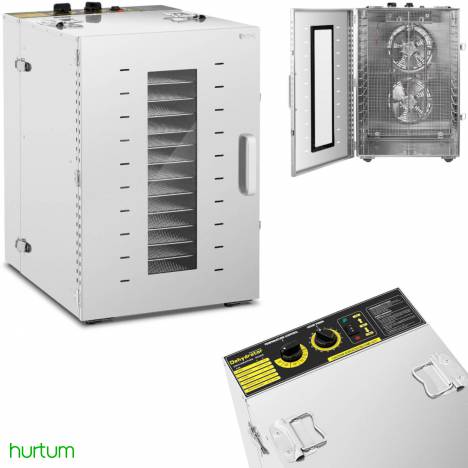 Cechy produktu: - Wydajność - grzałka 1500 W szybko wytwarza temperaturę optymalną do suszenia. - Pojemność - 16 wyjmowanych tac zmieści wiele produktów. - Wygoda - automatyczny timer w zakresie 0-15 h. - Wytrzymałość - atrakcyjna i solidna konstrukcja ze stali nierdzewnej. - Regulacja - możliwość ustawienia temperatury w zakresie od 40 do 90C.