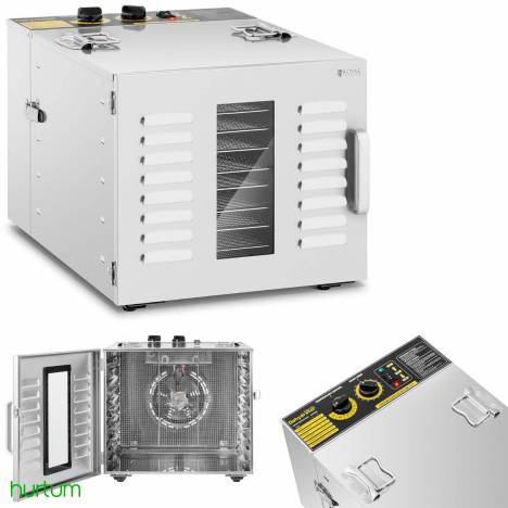 Cechy produktu: - Wydajność - grzałka 1000 W szybko wytwarza temperaturę optymalną do suszenia. - Pojemność - 10 wyjmowanych tac zmieści wiele produktów. - Wygoda - automatyczny timer w zakresie 0-15 h. - Wytrzymałość - atrakcyjna i solidna konstrukcja ze stali nierdzewnej. - Regulacja - możliwość ustawienia temperatury w zakresie od 40 do 90C.