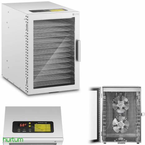 Cechy produktu: - Wydajność - grzałka 800 W szybko wytwarza temperaturę optymalną do suszenia - Pojemność - 12 wyjmowanych tac zmieści wiele produktów - Wygoda - automatyczny timer w zakresie 0.5-24 h - Wytrzymałość - atrakcyjna i solidna konstrukcja ze stali nierdzewnej - Regulacja - możliwość ustawienia temperatury w zakresie od 20 do 90C