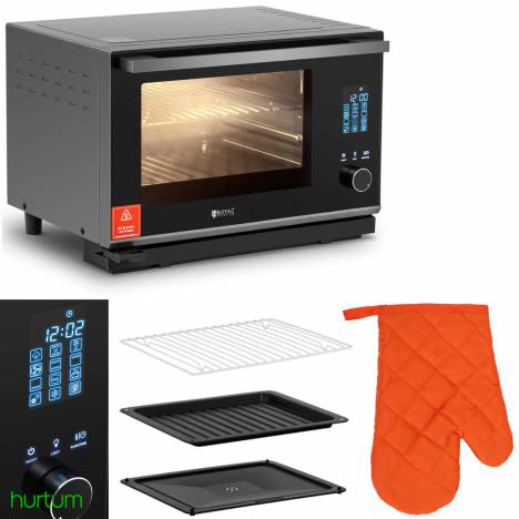 Piec konwekcyjny marki Royal Catering sprawdzi się doskonale w pizzeriach. restauracjach. bistrach. firmach cateringowych. barach itp. Pozwala uzyskać potrawy o wyjątkowych walorach smakowych. Posiada moc 2100 W. dzięki której wnętrze nagrzewa się do 220C. Timer umożliwia ustawienie czasu pieczenia w zakresie do 180 minut. Funkcja pary gwarantuje uzyskanie pulchnego ciasta oraz kruchego. soczystego mięsa. Duży zbiornik na wodę 1.2 l wystarcza na najdłuższe programy pieczenia. Duża komora ma 3-poziomową regulację wysokości tacek (3 w zestawie). Wnętrze zostało wykonane ze stali nierdzewnej. co sprawia. że jest wyjątkowo trwałe i łatwe do wyczyszczenia. Podświetlenie zapewnia pełną kontrolę pieczenia.
