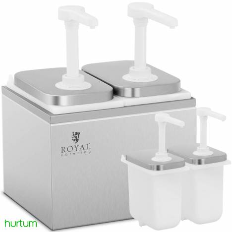 Cechy produktu: - Wytrzymałość - obudowa ze stali nierdzewnej. - Praktyczność - pojemnik z pompką. - Solidność - ścianka obudowy o grubości 0.6 mm. - Efektywność - pojemność 2 x 2 l. - Precyzja - łatwa kontrola dozowanego sosu.