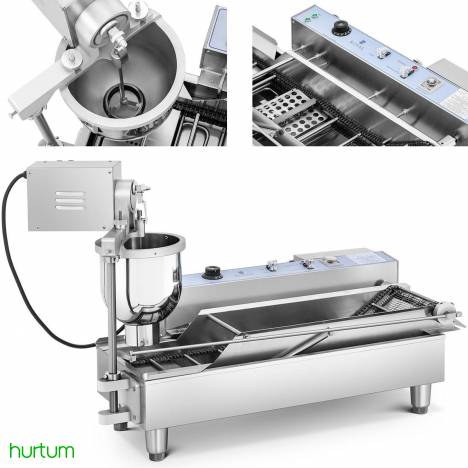 Urządzenie przystosowano do porcjowania. formowania. smażenia i obracania dużej liczby wypieków typu donut. Cały proces jest w pełni zautomatyzowany. Maszyna ma wysoką wydajność. do 900 pączków w ciągu jednej godziny. Do wyboru są trzy rozmiary: mały (śr. 4-5cm). średni (6-7cm). duży (8-9cm). 23-litrowy zbiornik na olej gwarantuje równomierne smażenie a kranik ułatwia zlewanie tłuszczu. Odpowiednia ilość uformowanego ciasta opada z dozownika na rozgrzany olej. Taśma przesuwa pączki a specjalny mechanizm obraca je na drugą stronę. Gotowe wypieki przerzucane są na podstawioną tackę (brak w zestawie). Maszyna formuje w tym samym czasie maksymalnie dwa pączki. Najważniejsze elementy maszyny wykonano ze stali nierdzewnej. Urządzenie posiada zabezpieczenie przed przegrzaniem. Regulowane nóżki zapewniają stabilność.