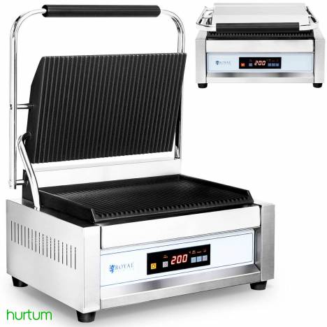 Grill kontaktowy marki Royal Catering idealnie sprawdzi się w profesjonalnych kuchniach, barach, food truckach, podczas kempingów czy imprez z cateringiem do grillowania burgerów, mięs, chleba, kanapek, warzyw, panini czy tortilli. Wszechstronność opiekacza to zasługa ryflowanej powierzchni, pozostawiającej na potrawach charakterystyczny wzorek. Duża moc 2200 W pozwala osiągnąć odpowiednią temperaturę w krótkim czasie. Wbudowany termostat regulowany w zakresie 50-300C utrzymuje grzanie na stałym poziomie. Płyty wykonane zostały z żeliwa, które bardzo dobrze przewodzi wysoką temperaturę oraz utrzymuje ją przez długi czas. Zastosowanie dwóch płyt - dolnej o wymiarach 34 x 23 cm oraz górnej o wymiarach 33 x 21 cm pozwala na grillowanie potraw z dwóch stron jednocześnie. Elektroniczny panel sterowania zapewnia intuicyjną obsługę.