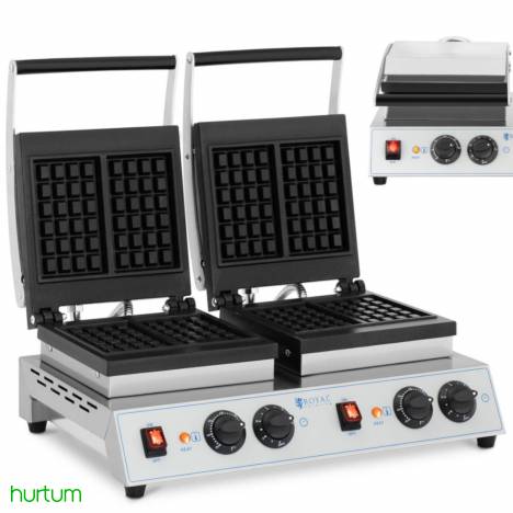 Gofrownica marki Royal Catering idealnie sprawdzi się w kawiarniach, restauracjach, na festynowych stoiskach czy w food truckach do wyrobu gofrów. Dzięki podwójnej konstrukcji pozwala przyrządzić jednocześnie 4 prostokątne gofry. Urządzenie posiada dużą wydajność - 2 x 1500 W, co zapewnia szybką gotowość do pracy. Temperatura regulowana jest w zakresie 50-300C. Urządzenie posiada automatyczny termostat. Czas pieczenia wynosi 1-5 min (funkcja timer). Płyty grzewcze o wymiarach 170 x 100 mm wykonane zostały z żeliwa. Rynienki zapobiegają wyciekaniu ciasta. Obudowa wykonana została ze stali nierdzewnej. Za bezpieczeństwo odpowiadają termiczne rączki i antypoślizgowe nóżki.
