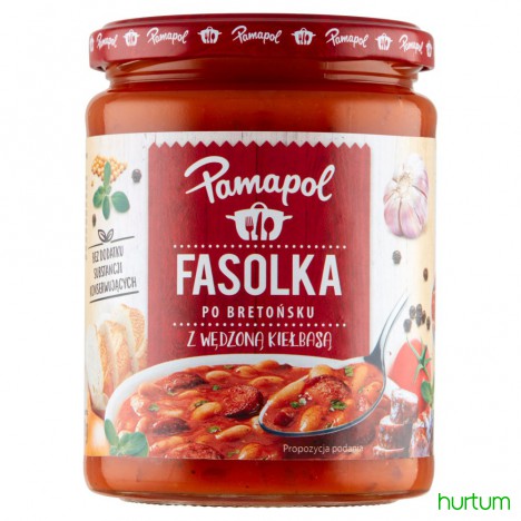 Fasola biała z kiełbasą drobiowo-wieprzową, wędzoną, parzoną w sosie pomidorowym. Produkt sterylizowany.
