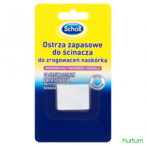 Ostrzeżenie: używać wyłącznie wymiennych ostrzy do ścinaczy Scholl. Nie używać do skóry podrażnionej. Chronić przed dziećmi. Przechowywać w suchym miejscu.