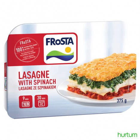 Makaron lasagne przekładany sosami: z serem Ricotta, szpinakowym, beszamelowym i pomidorowym; posypany tartym serem Gouda. Produkt głęboko mrożony.