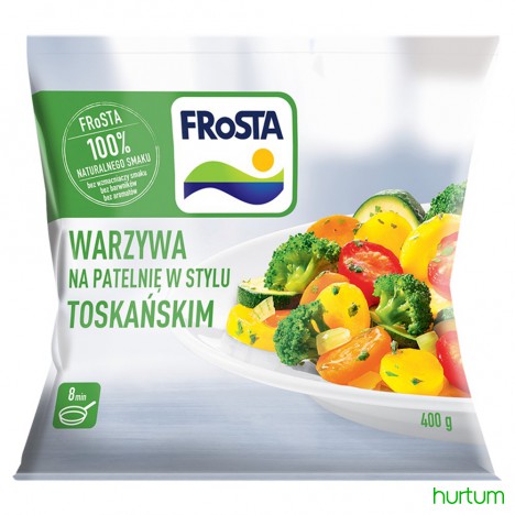 Mieszanka warzyw w stylu toskańskim, z sosem, przyprawiona bazylią. Produkt głęboko mrożony.